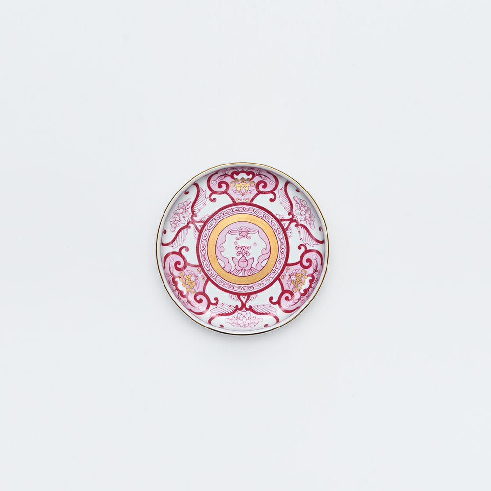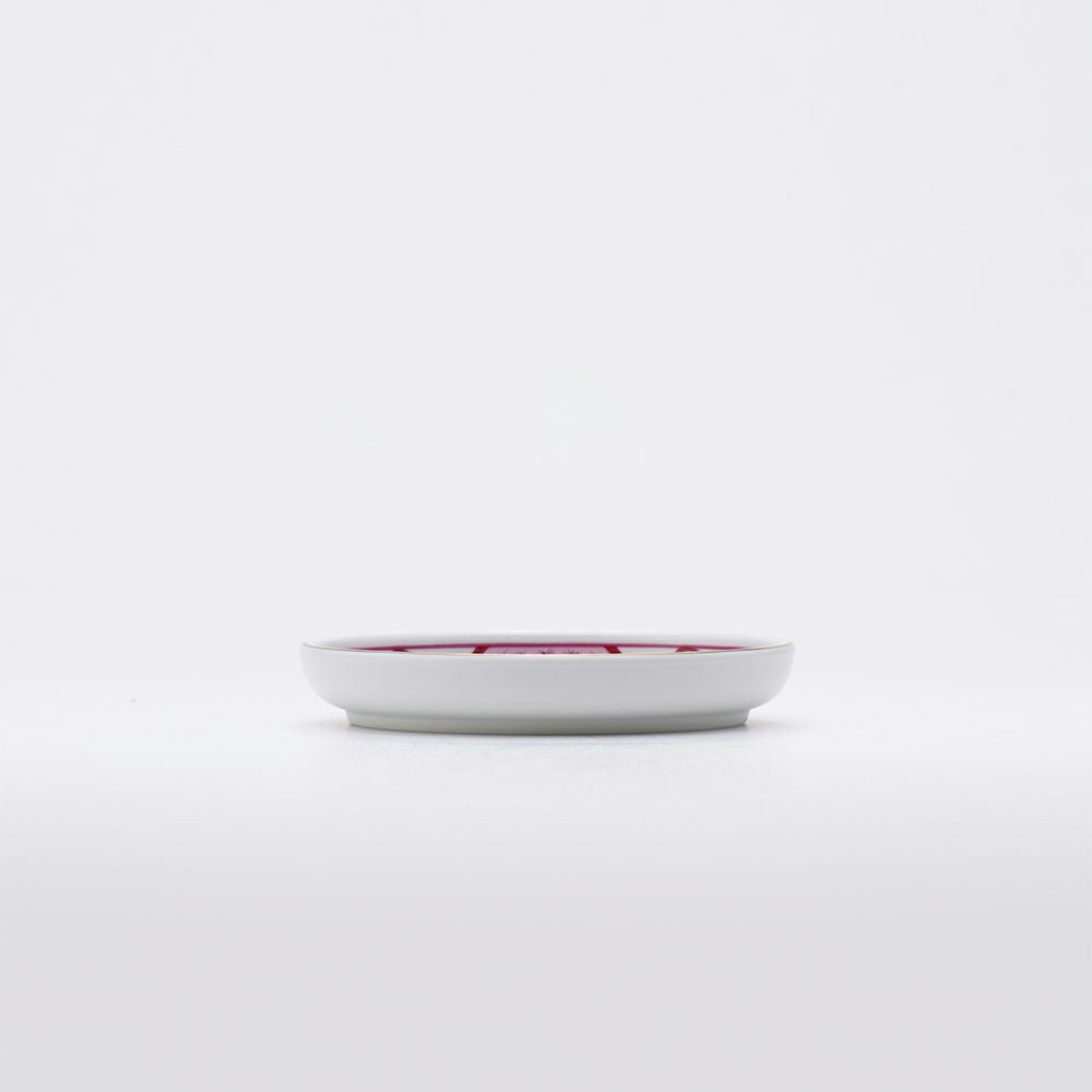 伝統的な古伊万里草花紋の柄を、日本の美しい紅葉を思わせるワインレッドとゴールドで表現。