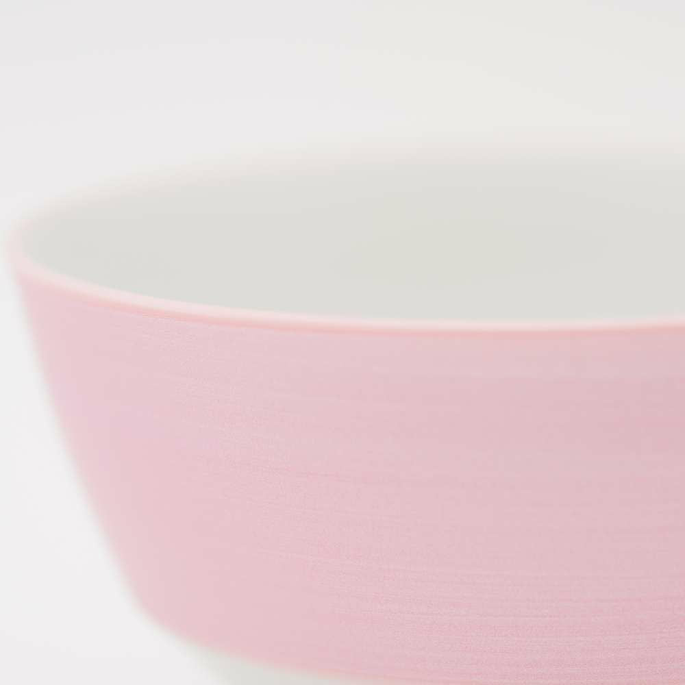 上品なパールピンクの、段が付いて持ちやすい飯碗