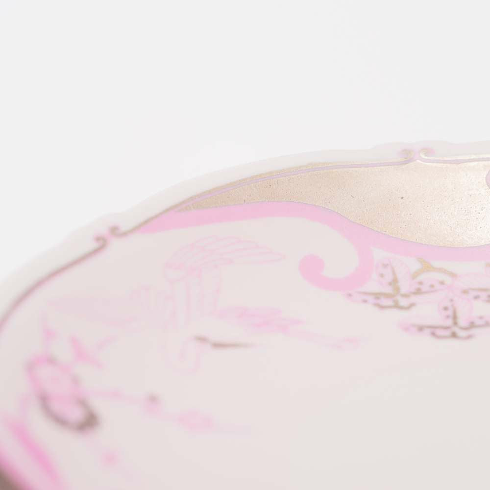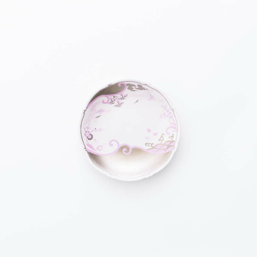 絵柄の繰り返し訪れる波は、吉事が繰り返される事を意味し繁栄を表す吉祥文様で、鶴は長寿のシンボルである事から、波鶴は繁栄と長寿を表す伝統的な絵柄です。 その吉祥文様を、デザインを変えずそのまま使い、配色を桜を思わせる2色のピンクとプラチナに変える事でモダンに表現しています。 吉祥文様は、先人の陶工たちが、使う人の暮らしを物質・精神両面から豊かにしたいとの思いから、有田焼に多く用いてきた文様です。 その思いを世界中の皆様に器を通して届ける事ができれば幸いです。
